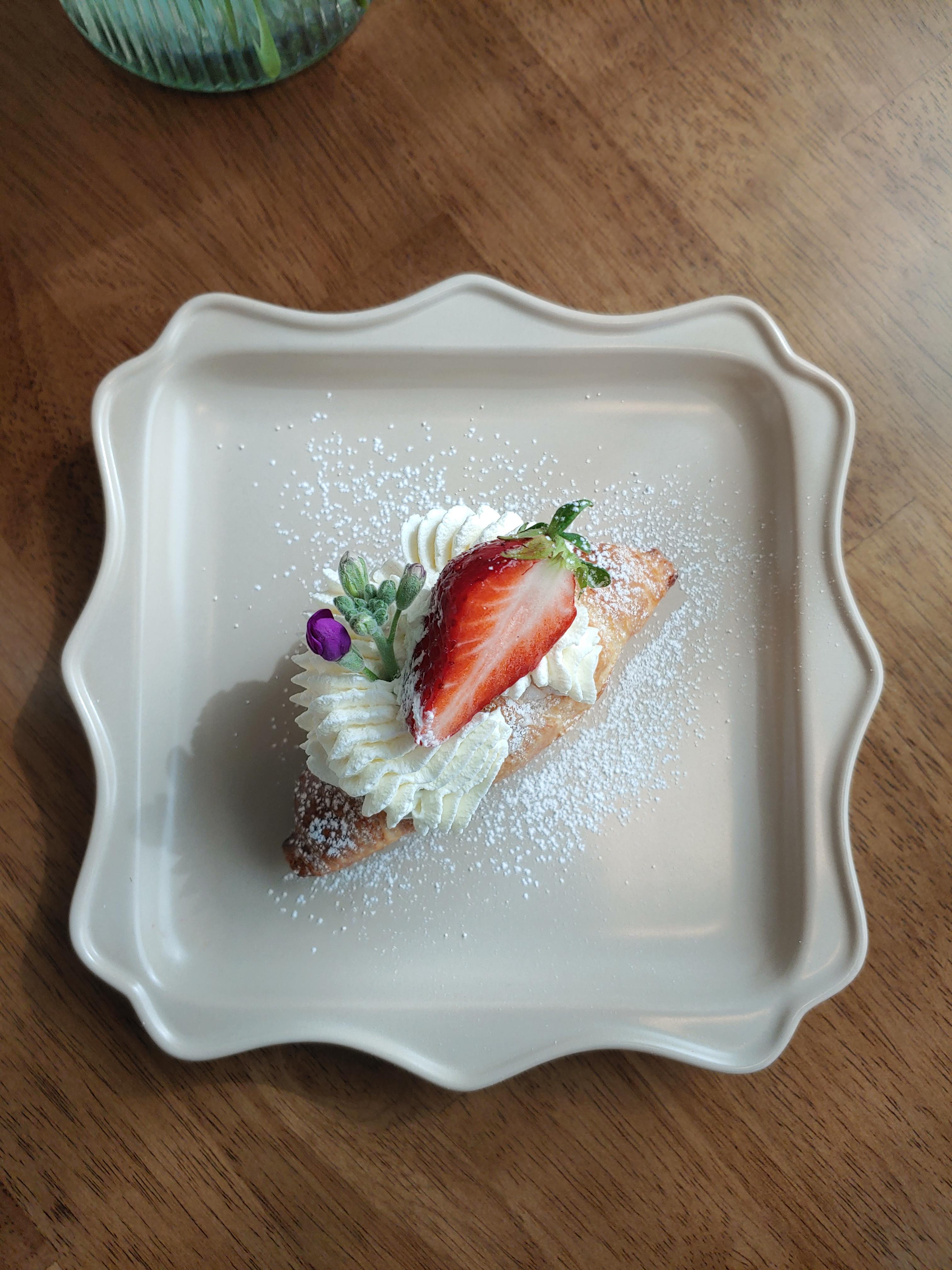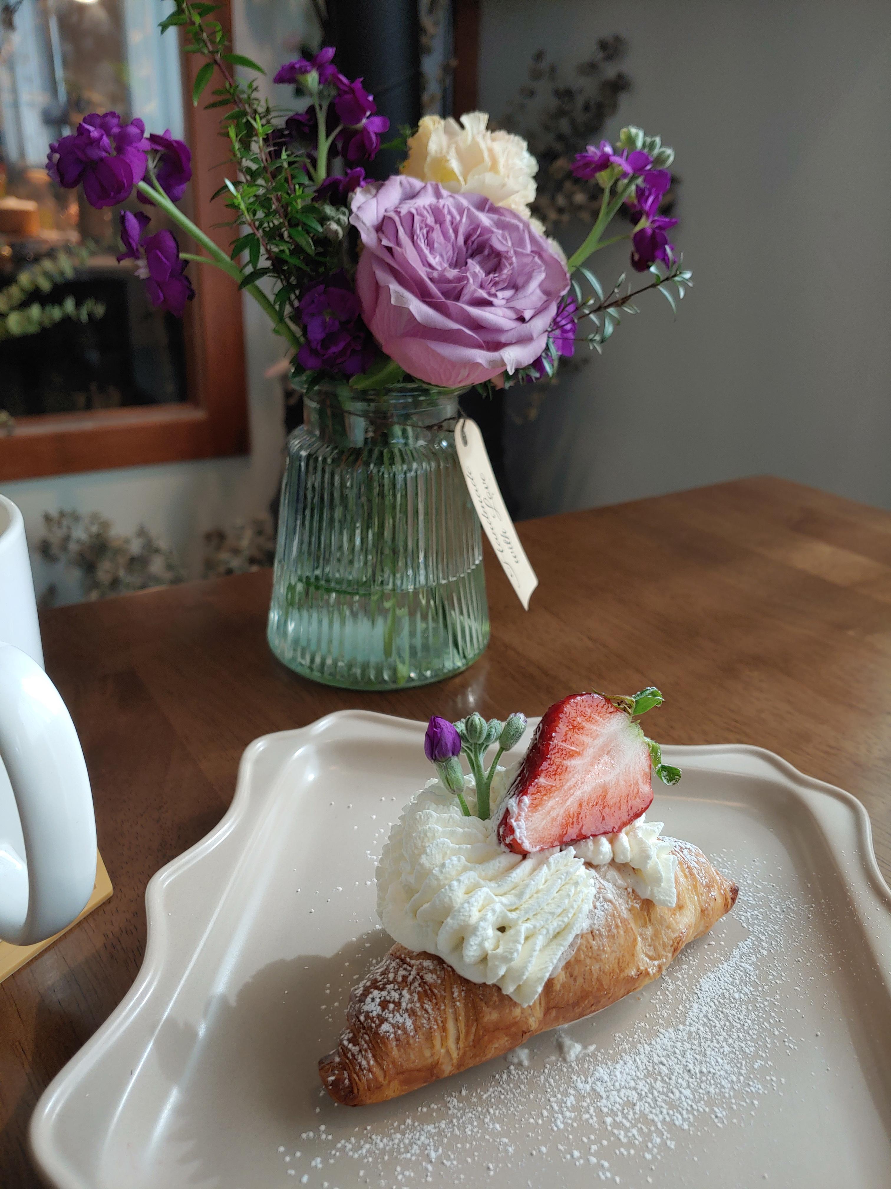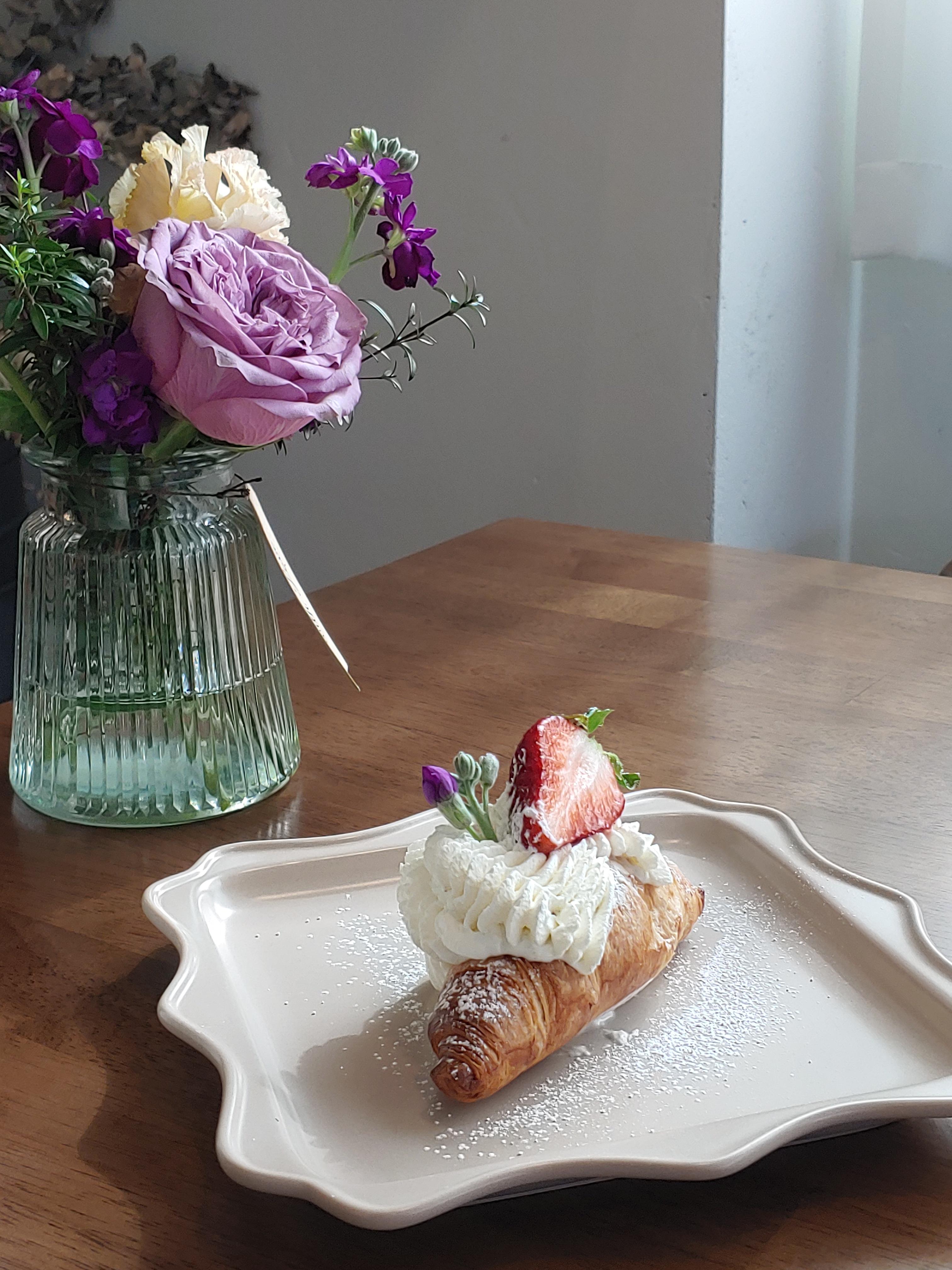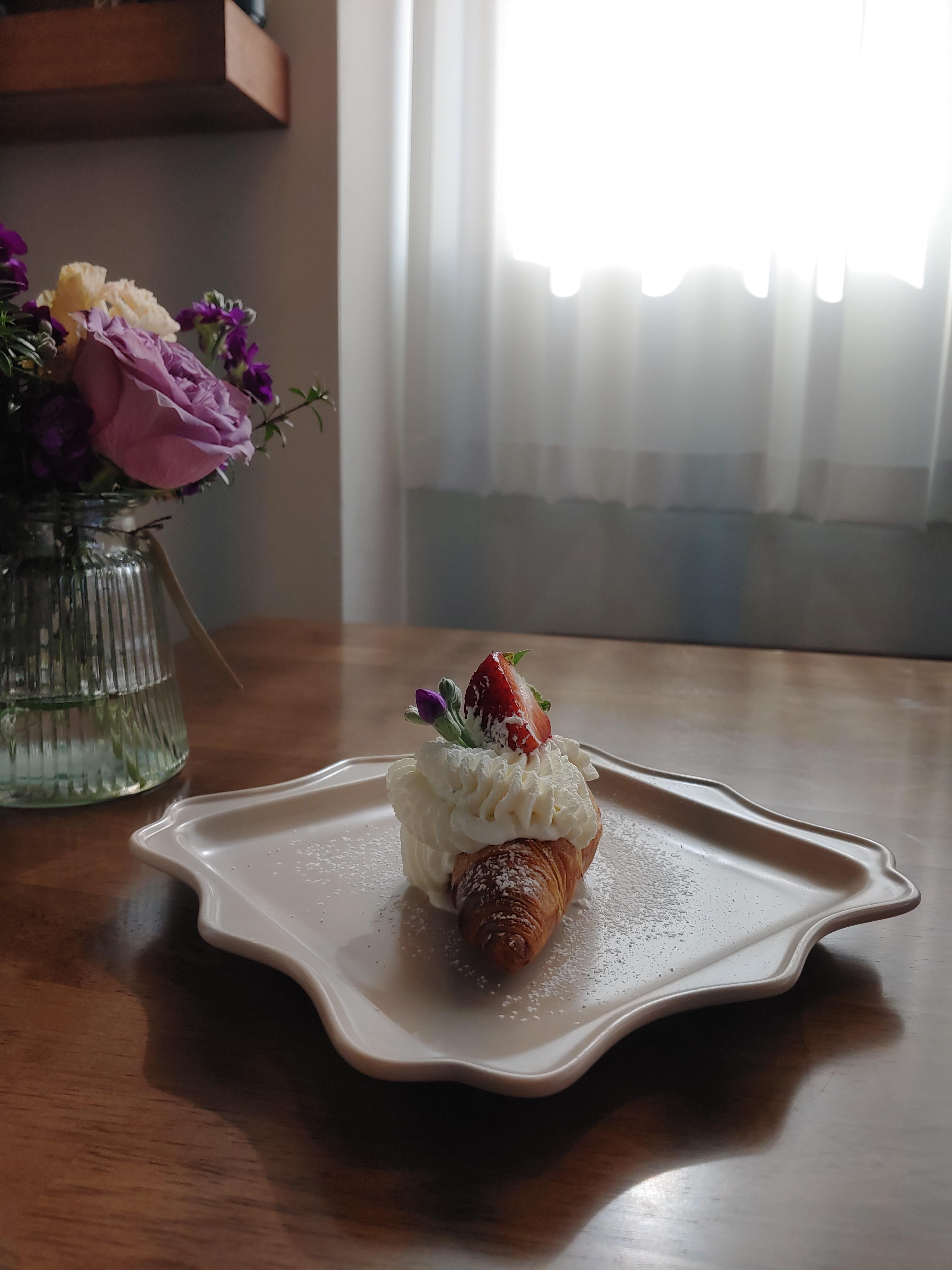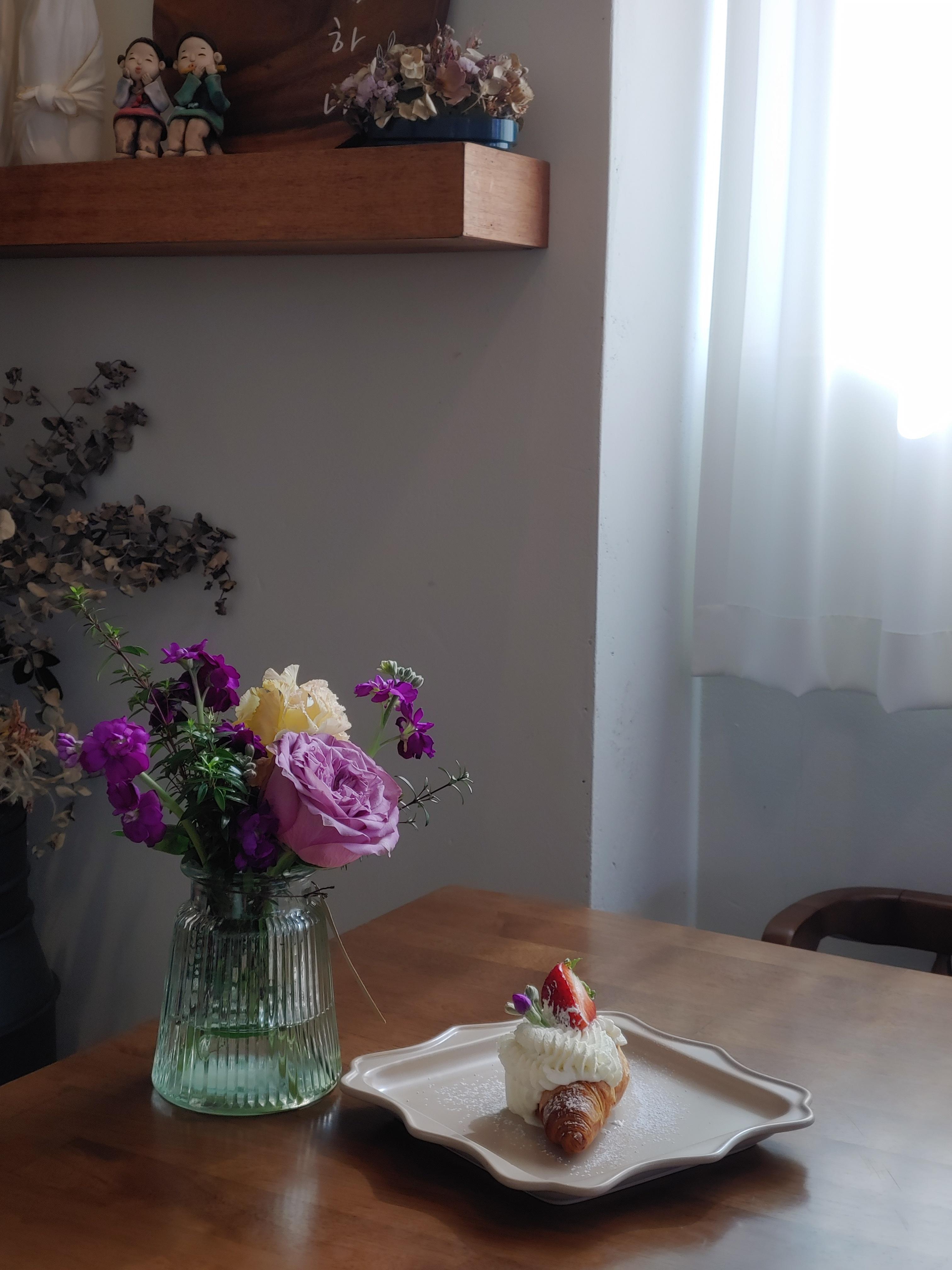 꽃잎 하나 카페의 디저트 사진은 이 디저트 자체만으로도 너무 이쁘지만 꽃과 함께 촬영할 수 있어서 더욱 더 예쁘게 촬영해 볼 수 있는 즐거움이었어요.