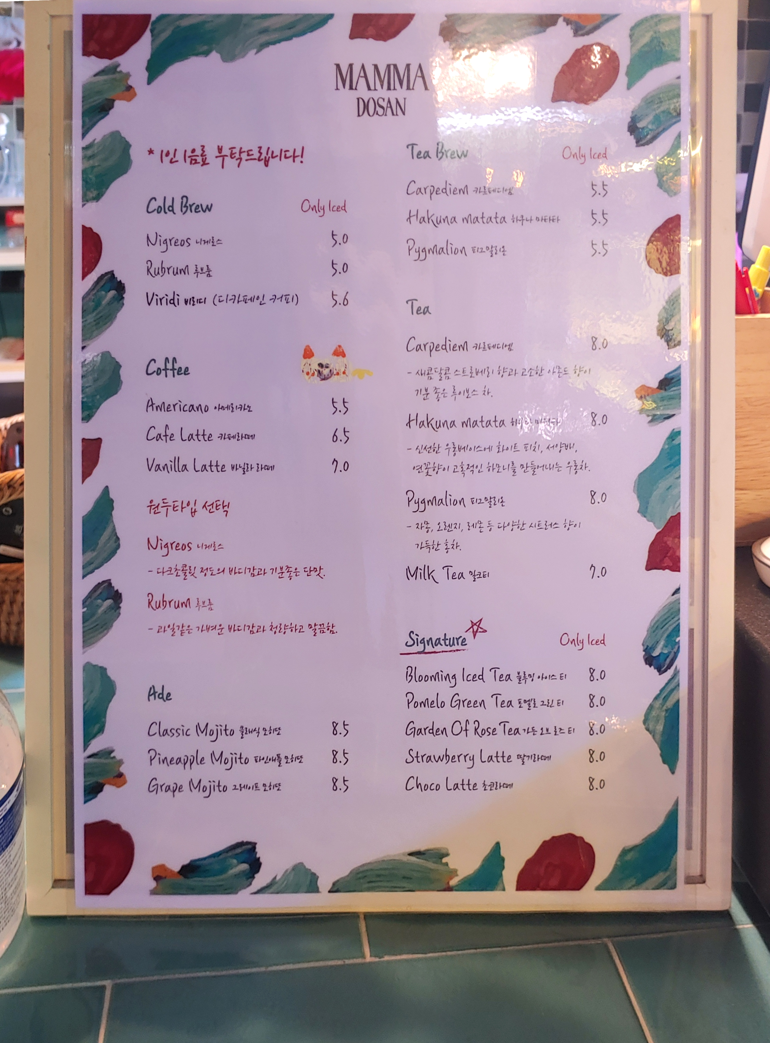 조금은 불편한 시선이 되었던 디저트와 메뉴판이었습니다. (그렇지만 음료와 디저트를 주문했습니다. 하하)