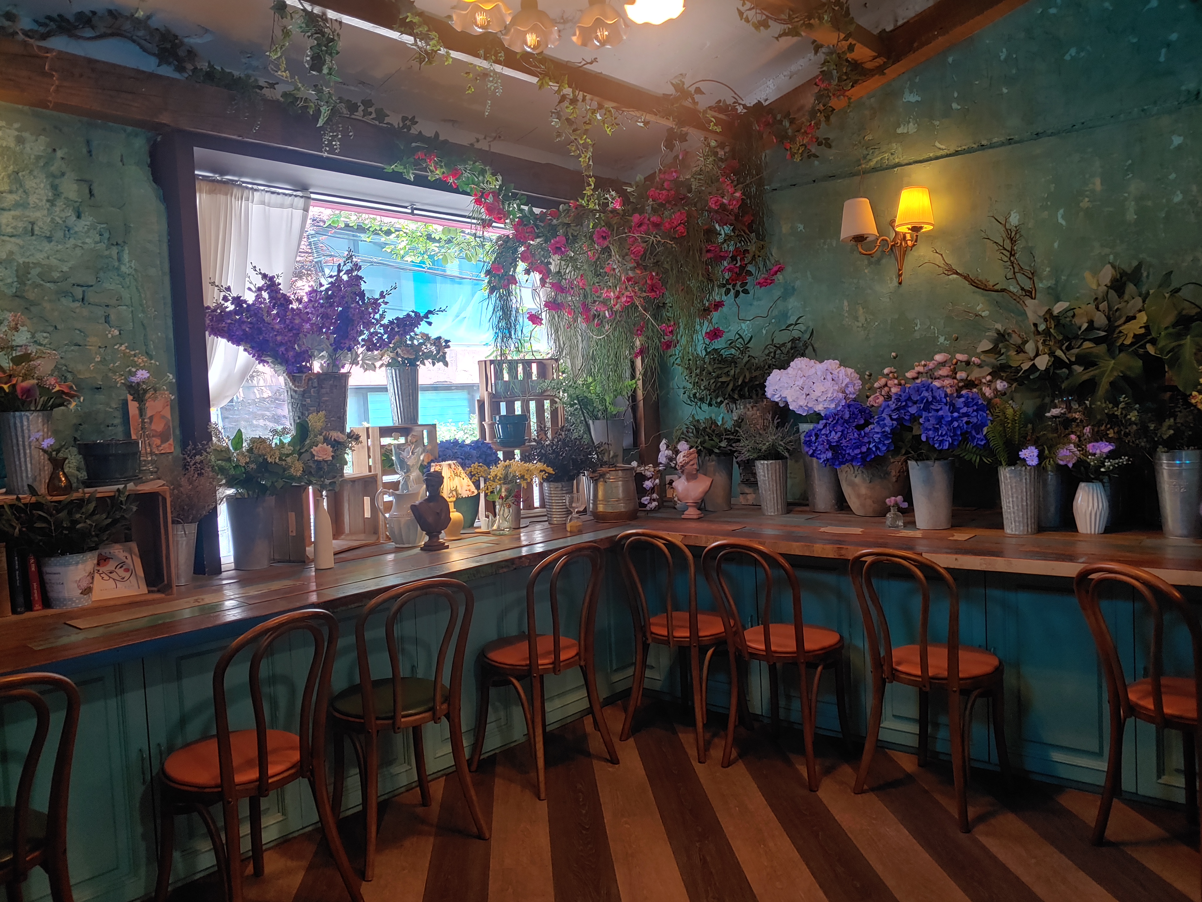 바 형태로 된 자리도 꽃으로 가득한 모습이라 향긋해 보이더라구요.
