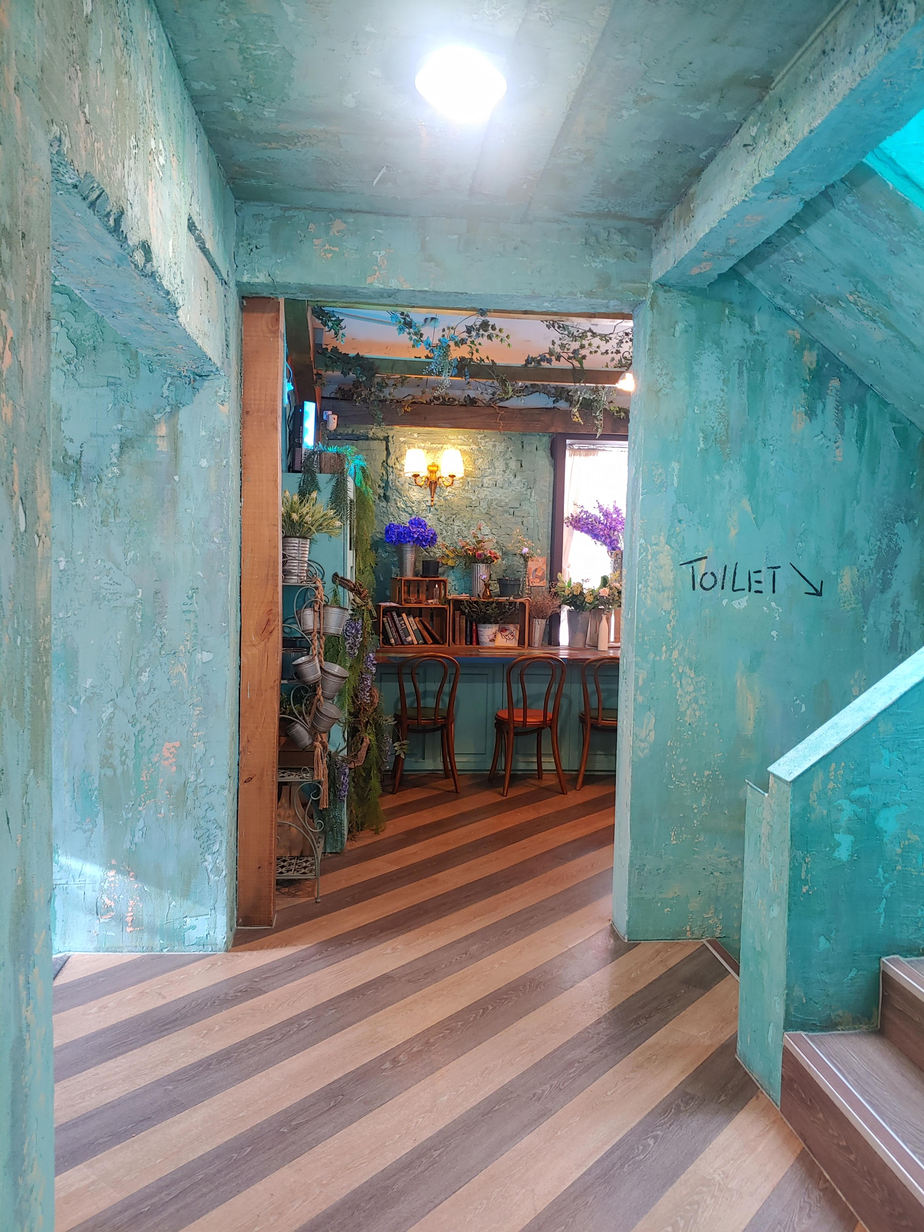 2층 올라서면서야 느낀 거지만, 1층에서부터 같은 민트 컬러로 벽지처럼 진행한 이 페인팅이, 백드롭 페인팅 한 작품처럼 진행한 거라 생각이 들더라구요.