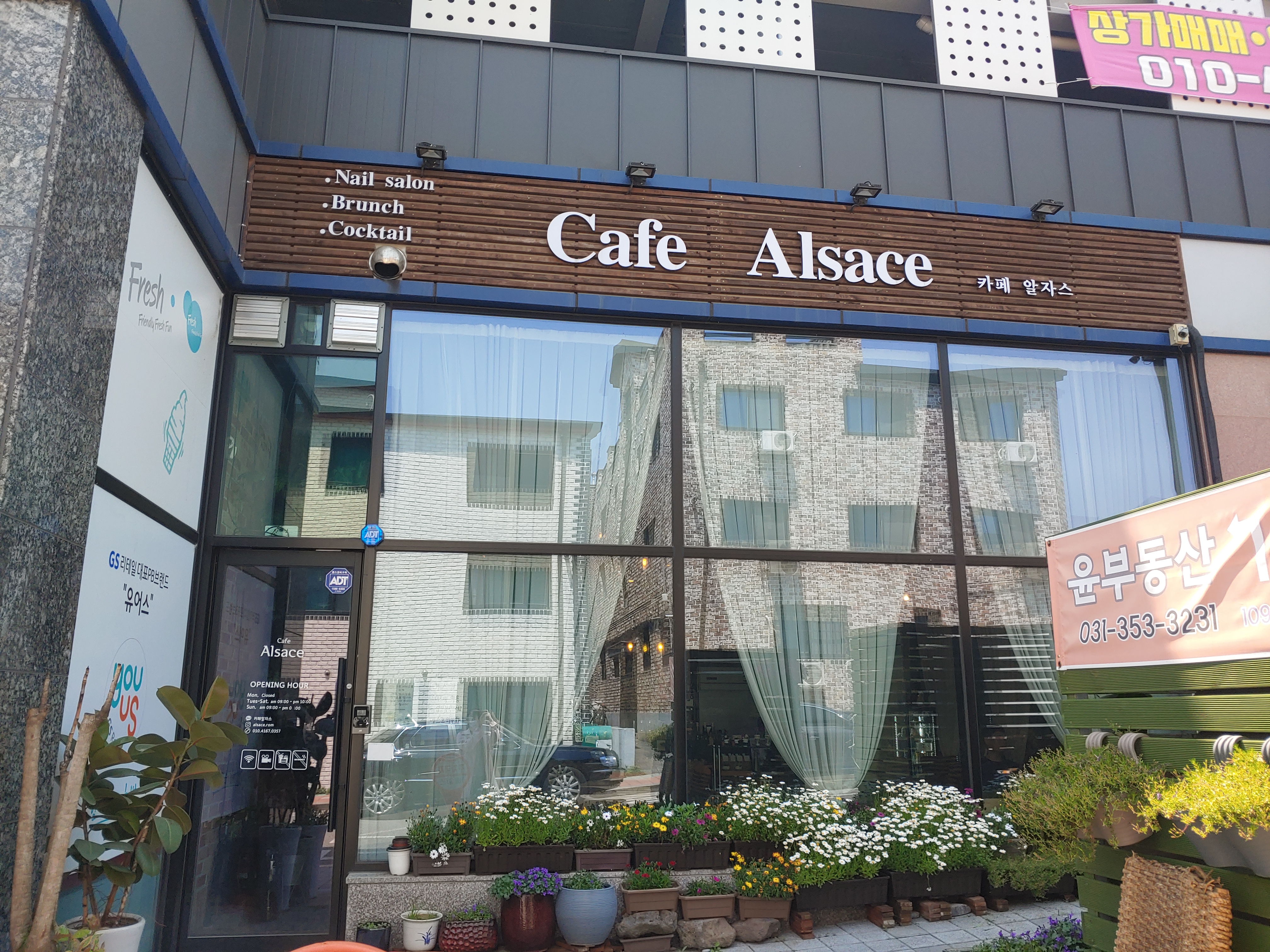 도착해서 간판을 보니, 메인 카페 알자스 옆에 네일 살롱과 칵테일도 적혀 있어요.