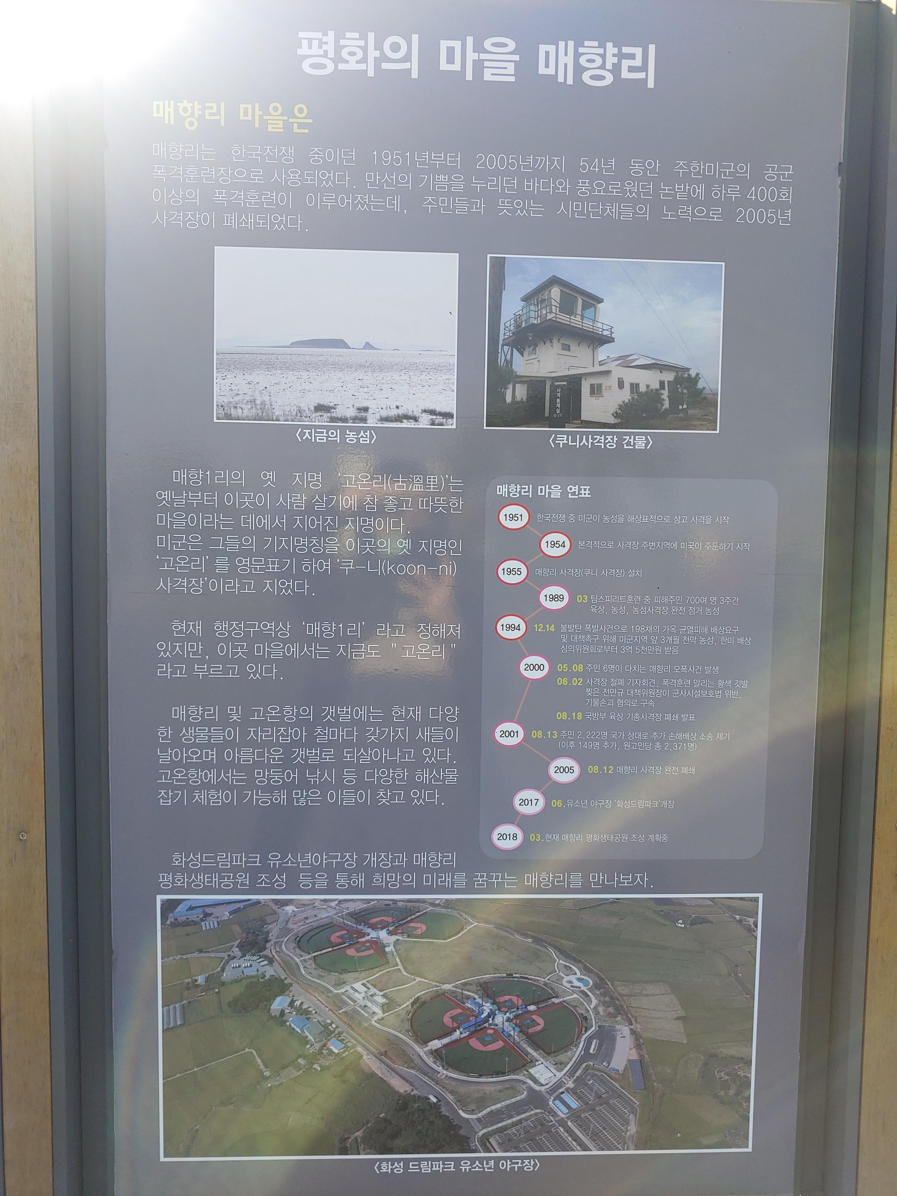 1951년 한국전쟁 때부터 2005년까지 54년 동안 폭격 소리가 가득했던 곳이 주민들과 시민단체들의 노력으로 사격장이 폐쇄되었으며 이후에 평화의 상징이 된 매향리였습니다.