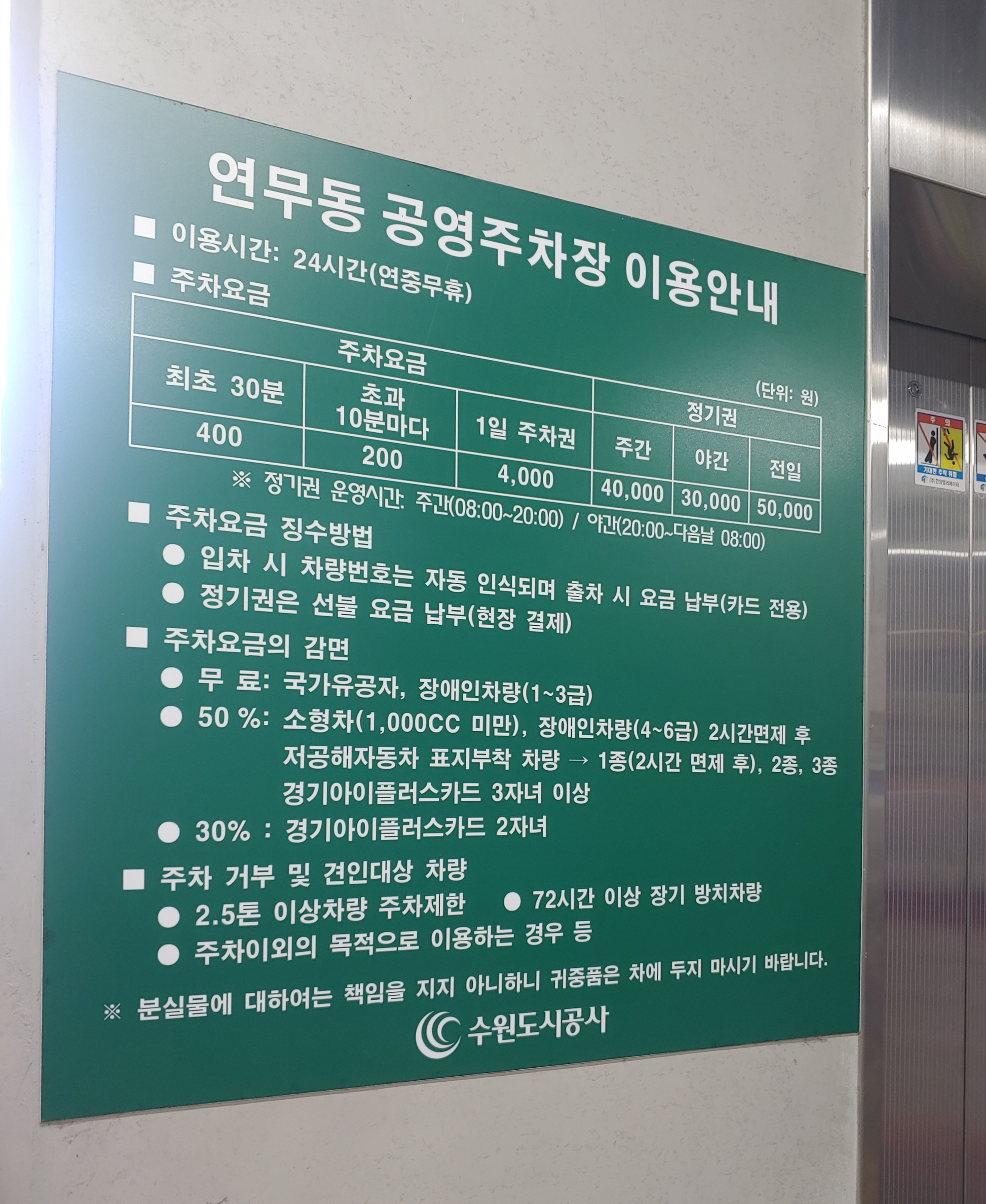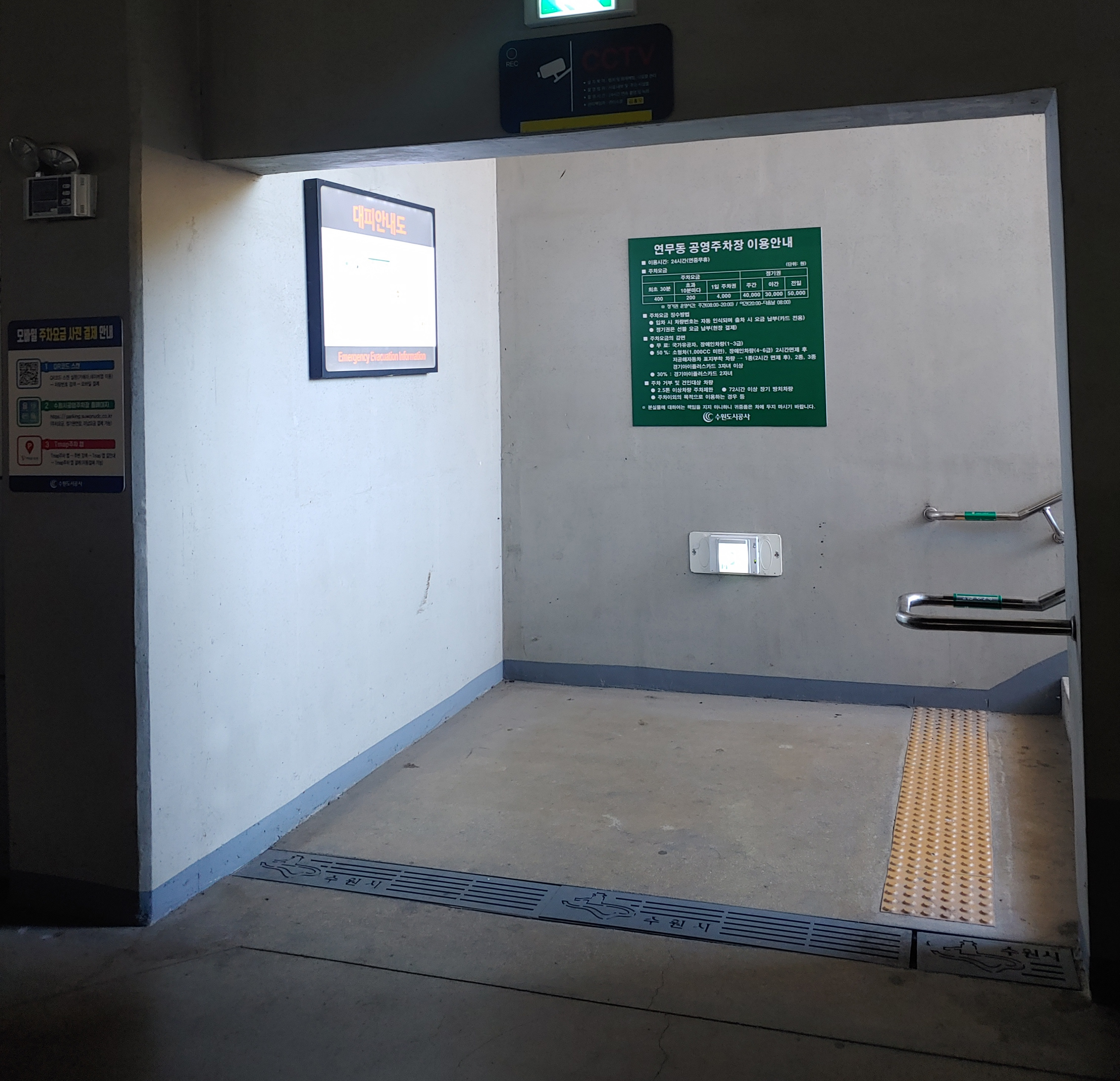 출구로 올라가기 전에는 수원 연무동 공영 주차장 이용 안내 내용이 있습니다.