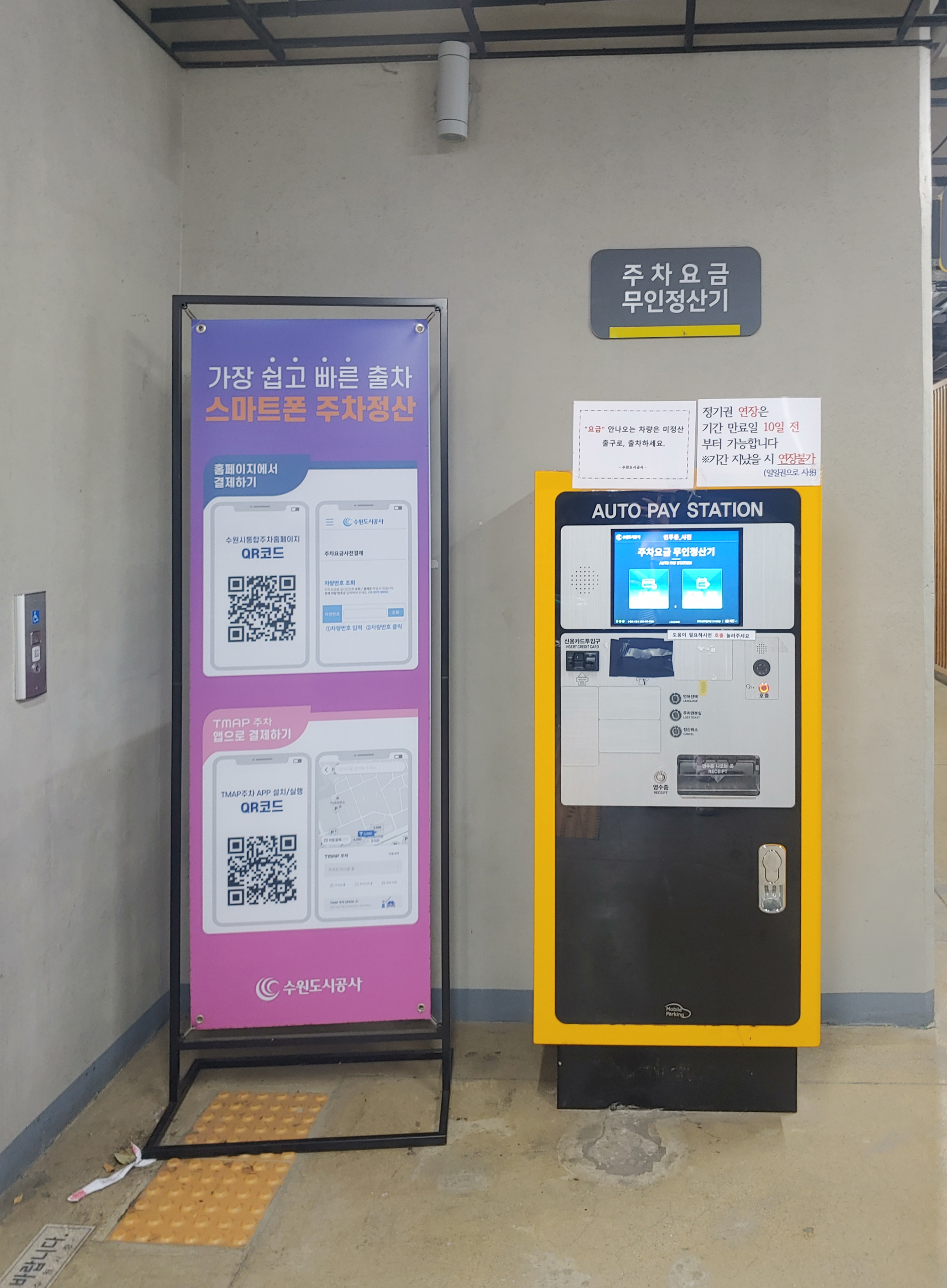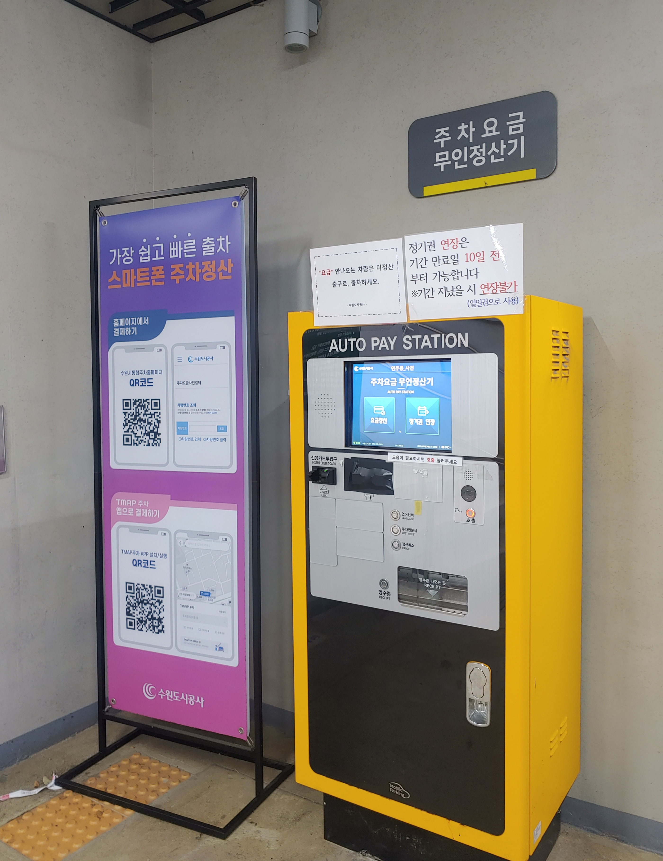 화장실 쪽으로 가는 길이었는데, 스마트폰 주차 정산 시스템과, 무인 정산기를 찾았습니다.