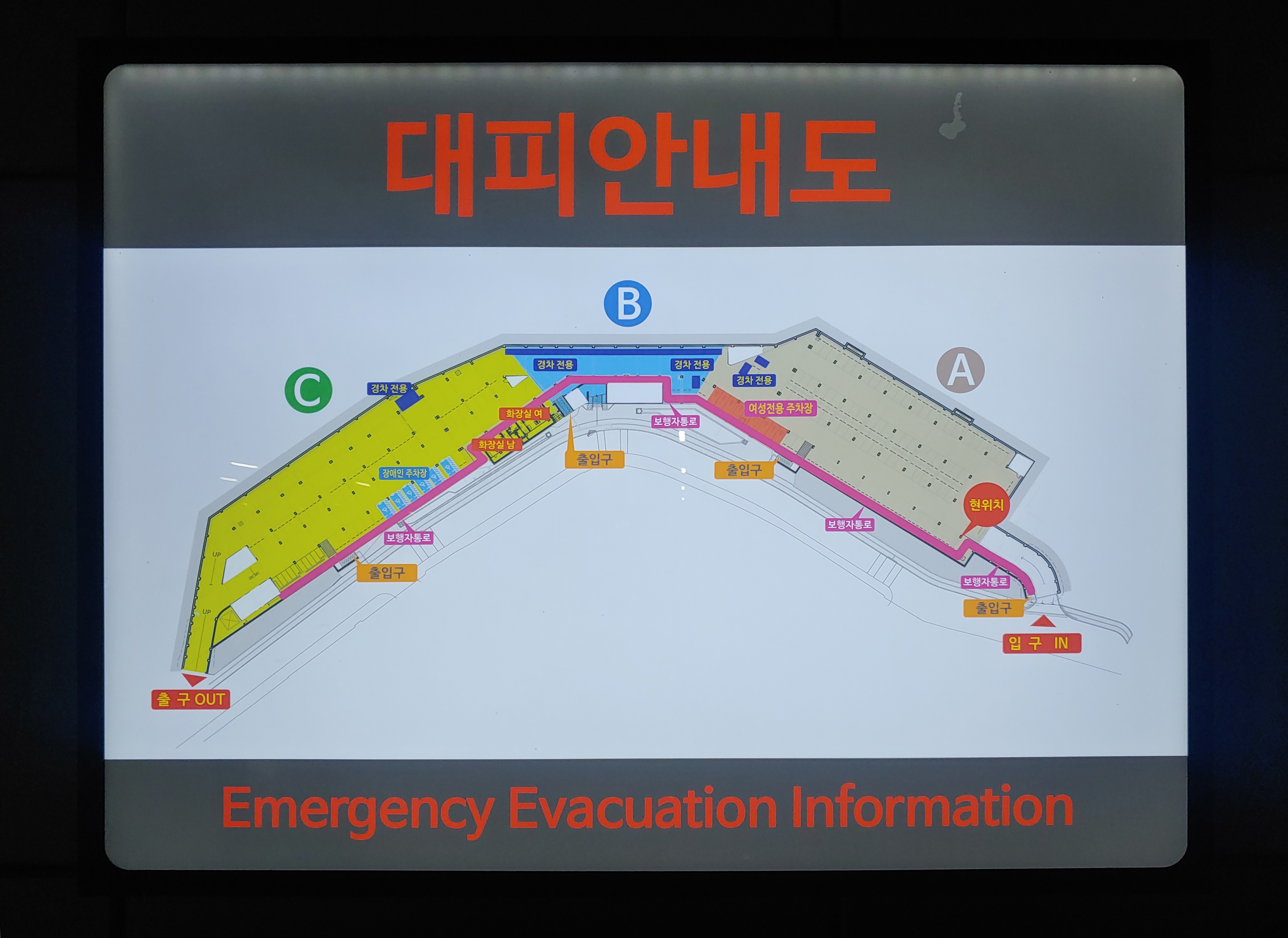 주차 라인이 아닌 곳에서도 주차가 빡빡하게 되어 있어서 힘들었던 거였어요. 보행자가 다니는 공간은 따로 있으니, 보행자 라인 입구만 찾으면 이동하기 수월합니다. (대피 안내도에서 핑크색 라인으로 표시되어 있습니다.)