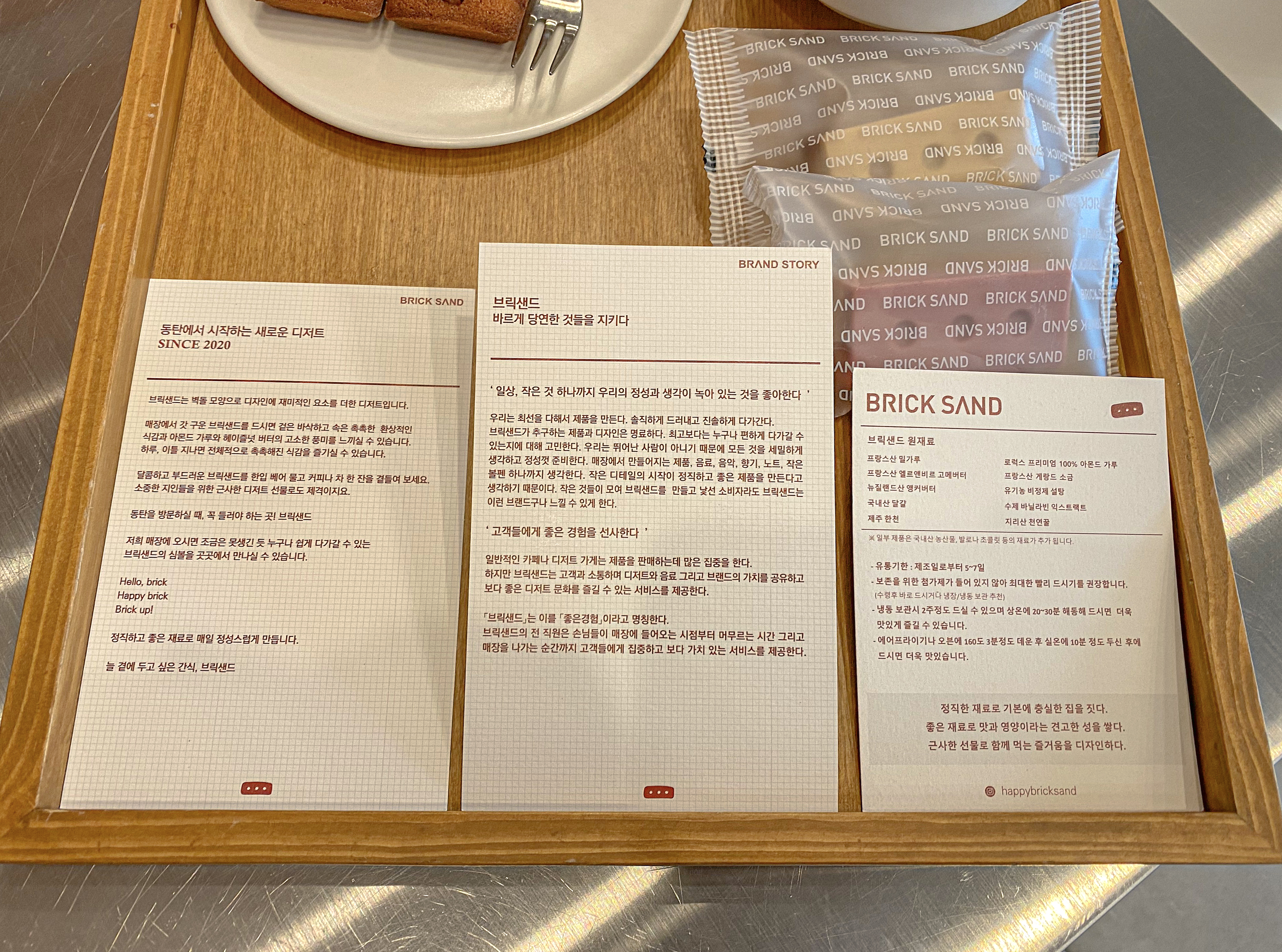 주문한 카페라떼와 휘낭시에 4개 말고도 브릭샌드에 대한 브랜드 설명이 있는 디자인 홍보물이 있었습니다.
