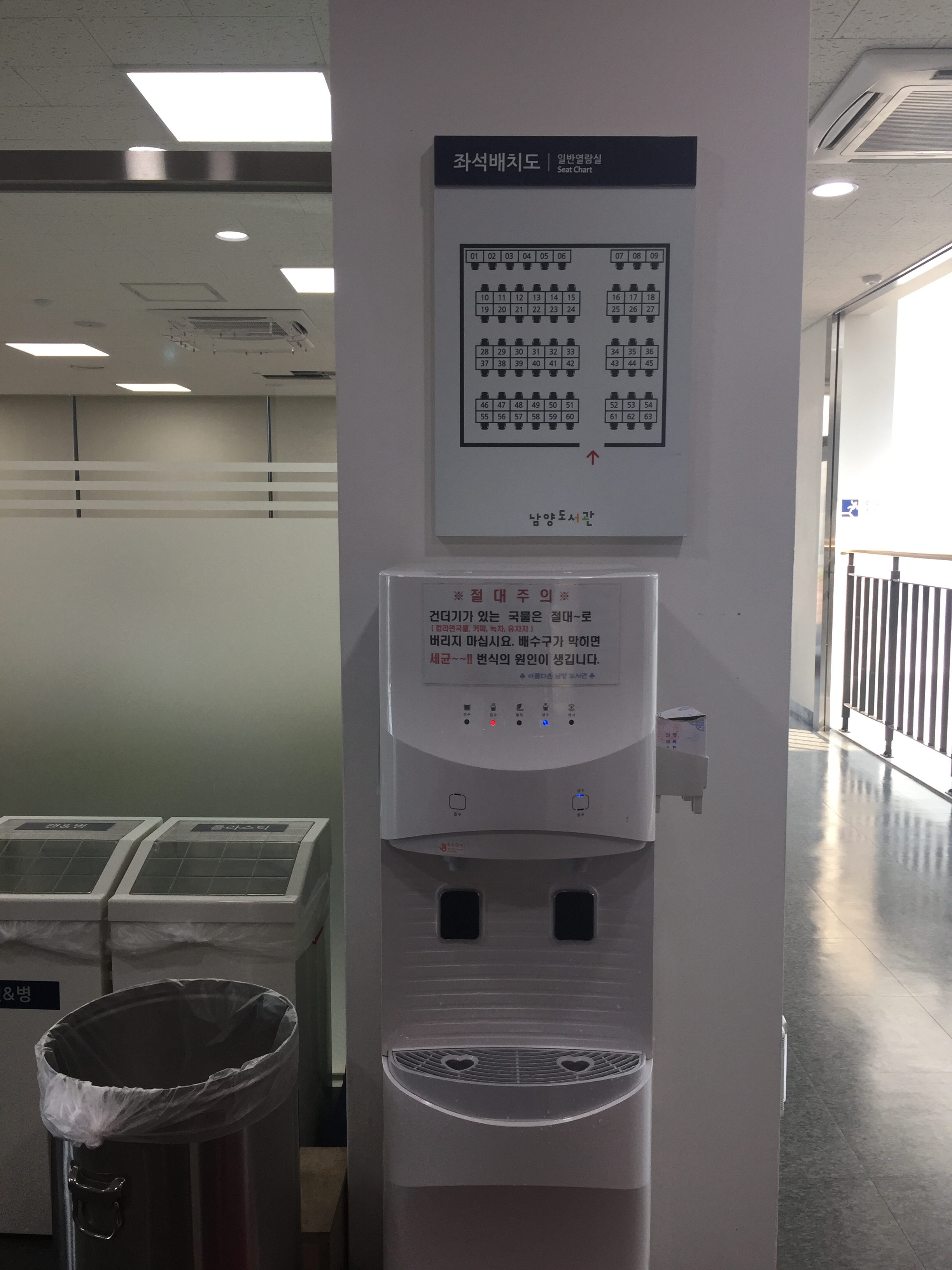 휴게실 가까이에는 열람실과 정수기가 있습니다.