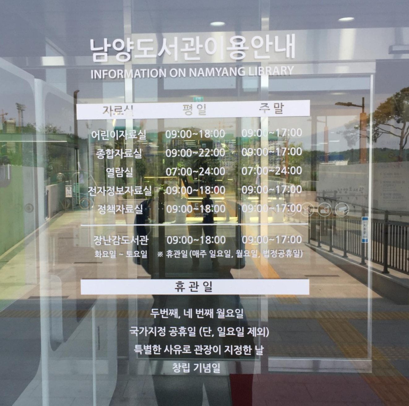 입구에 간단히 남양 도서관 이용 시간에 대한 정보가 있어 찍어왔습니다.