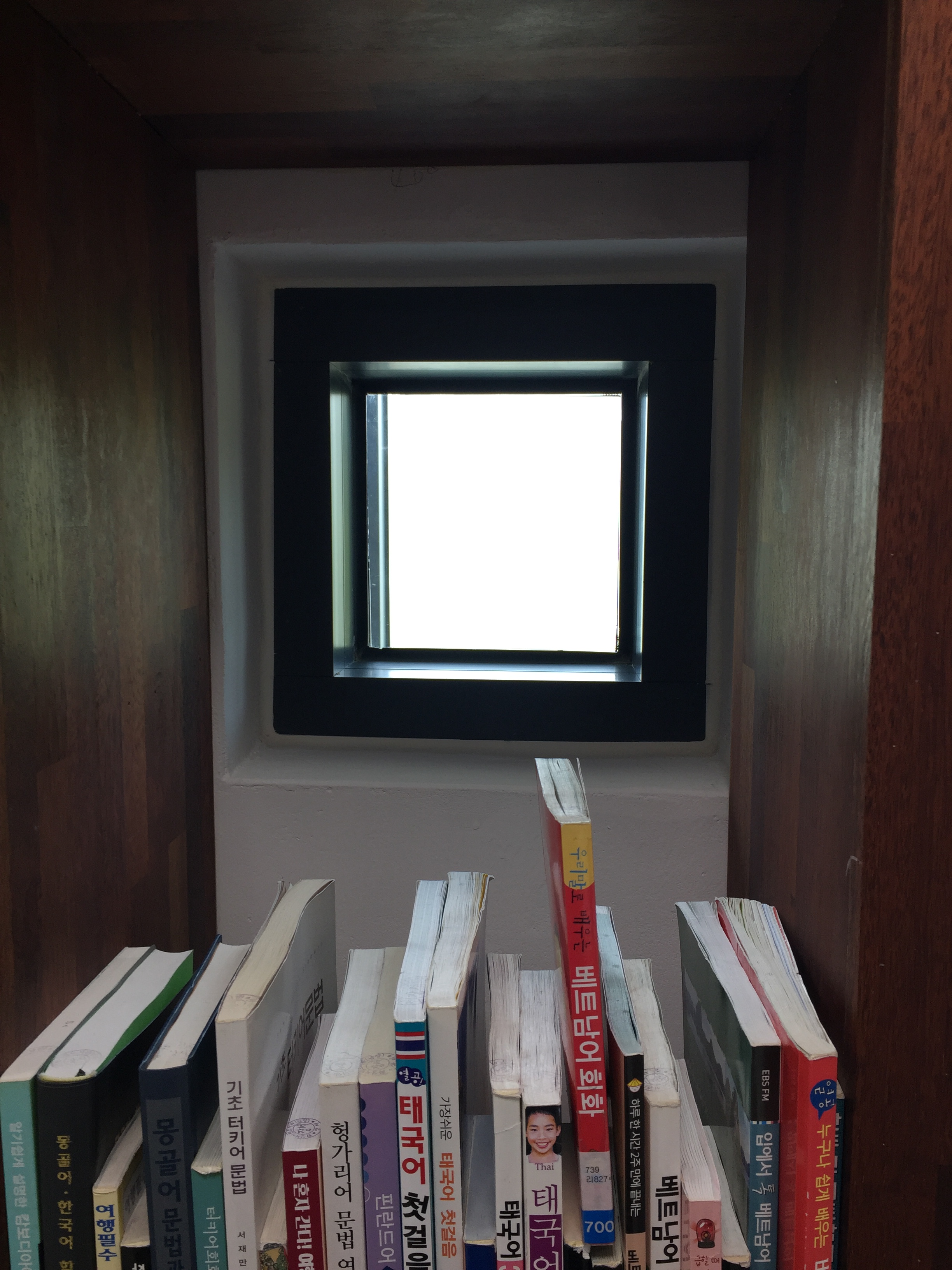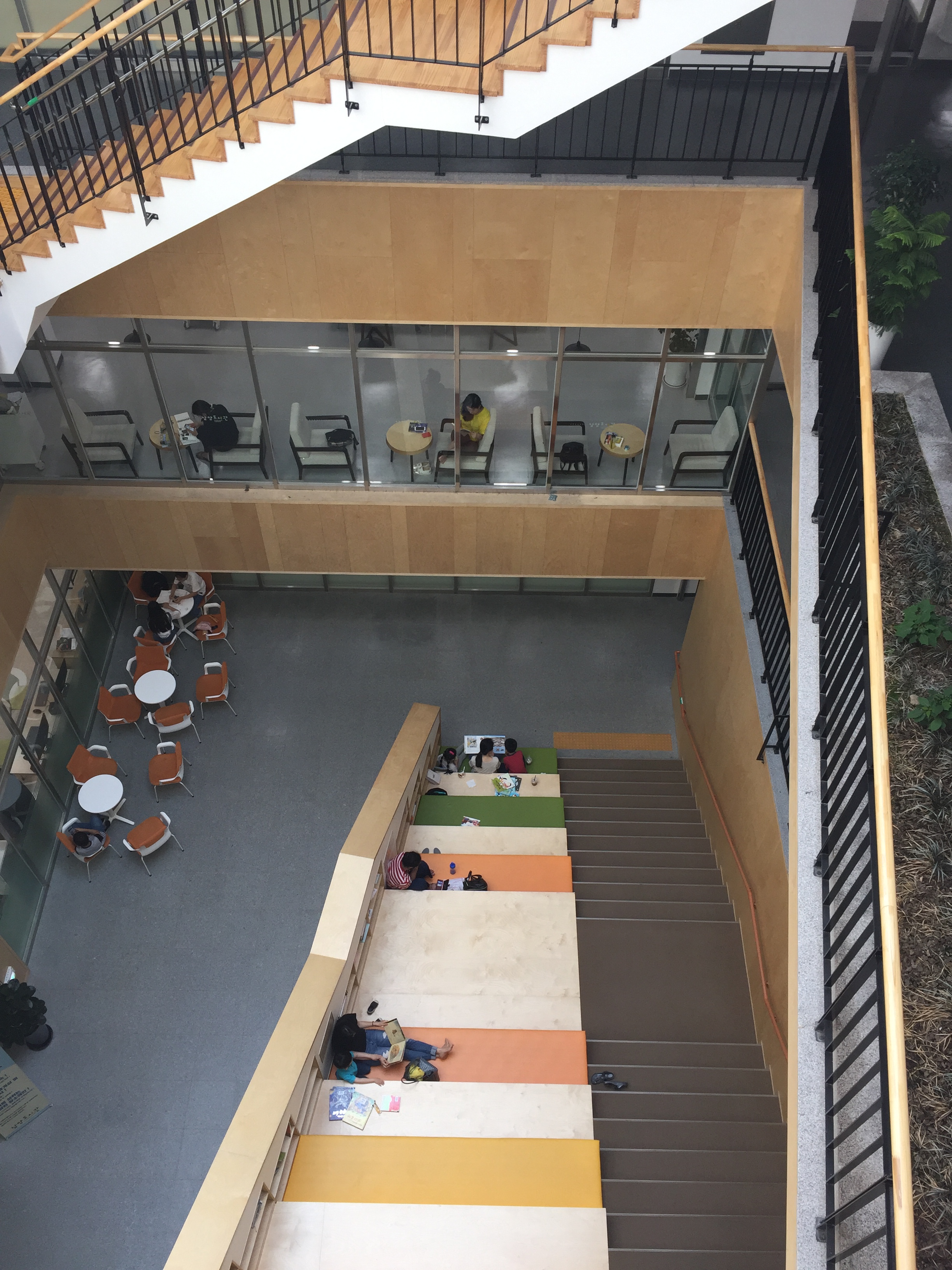 계단에 올라가 바라본 모습입니다. 오픈식으로 선반에 책이 있고 자유롭게 앉아서 책을 보게끔 되어 있습니다.